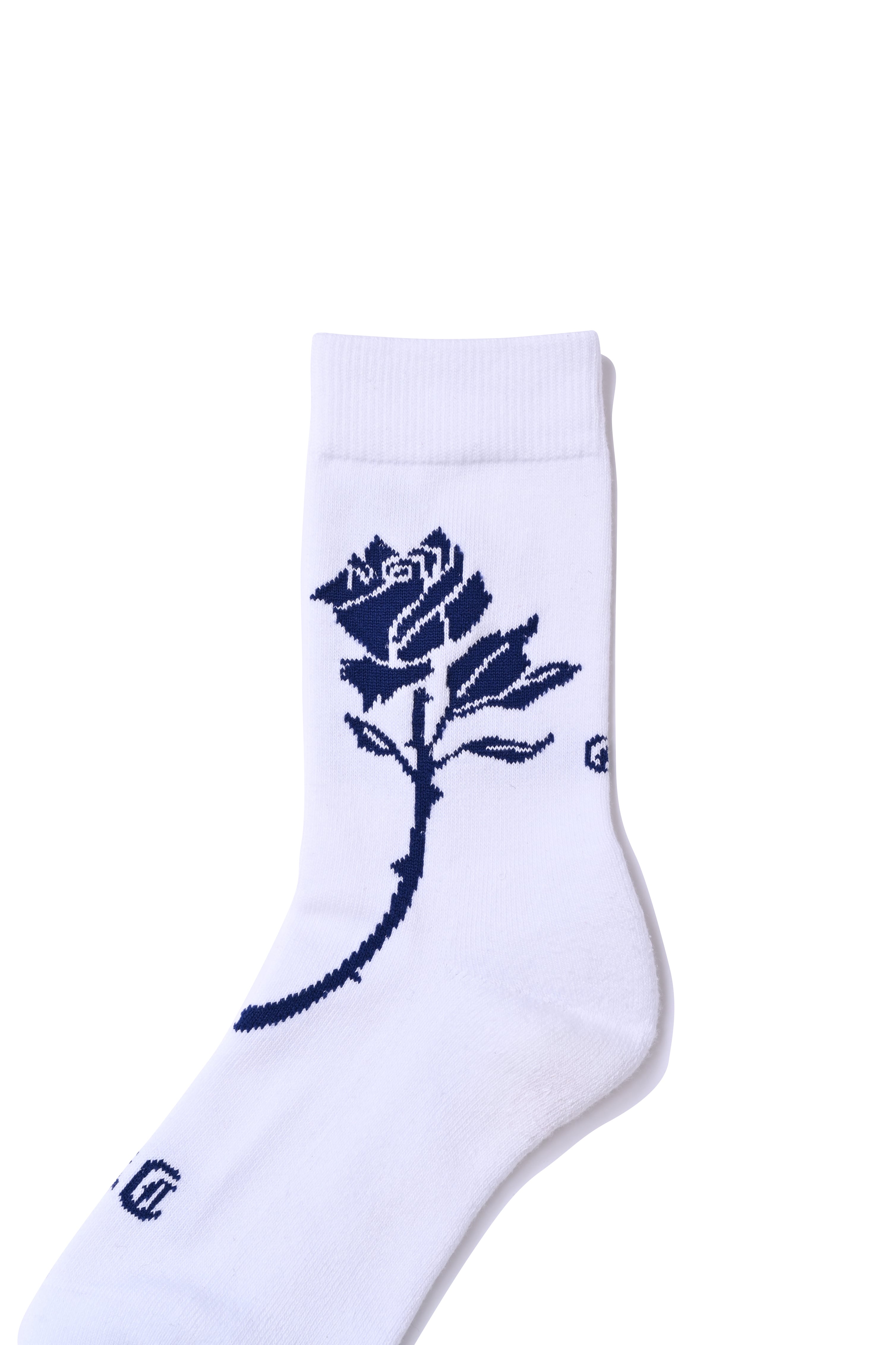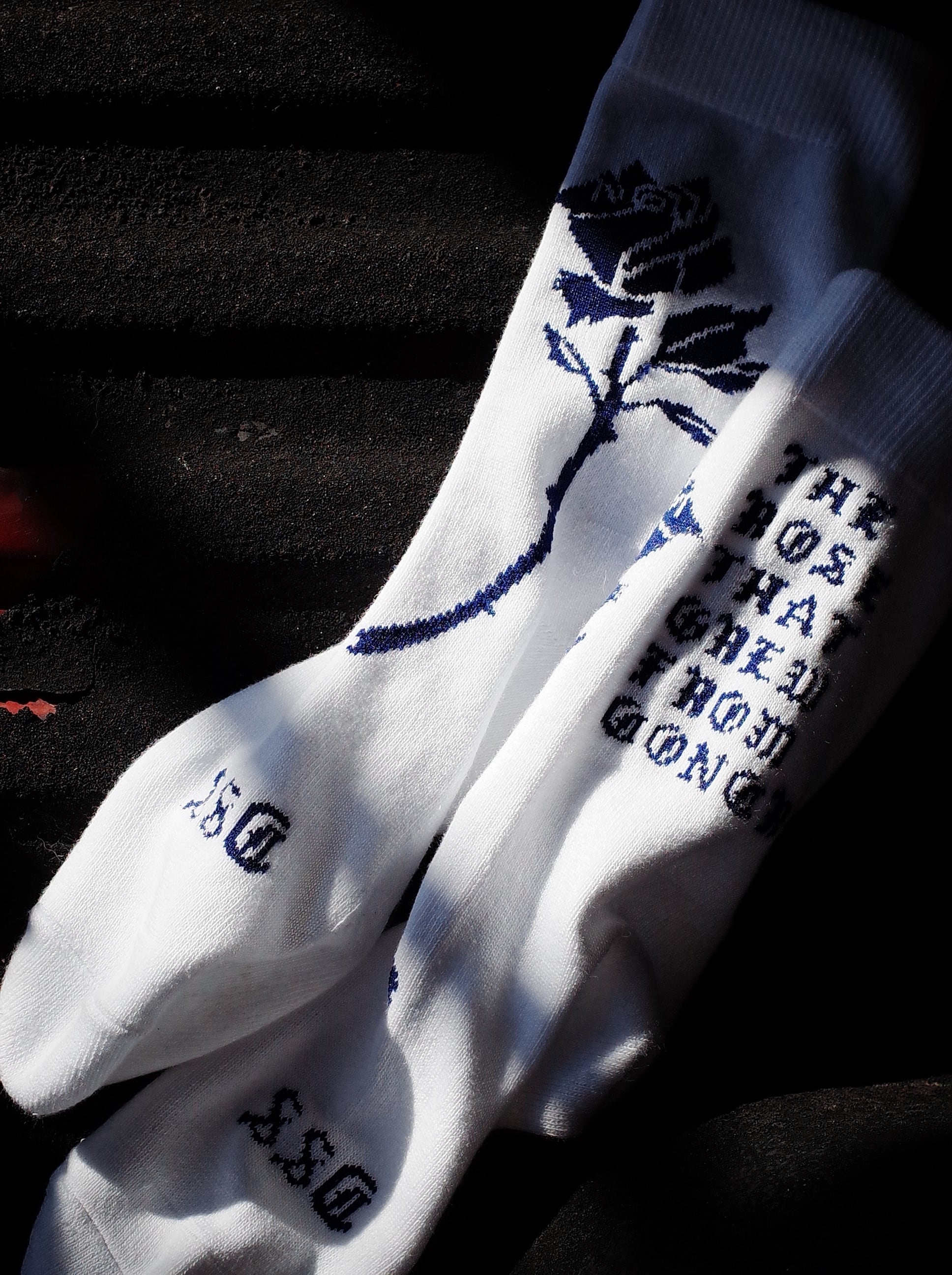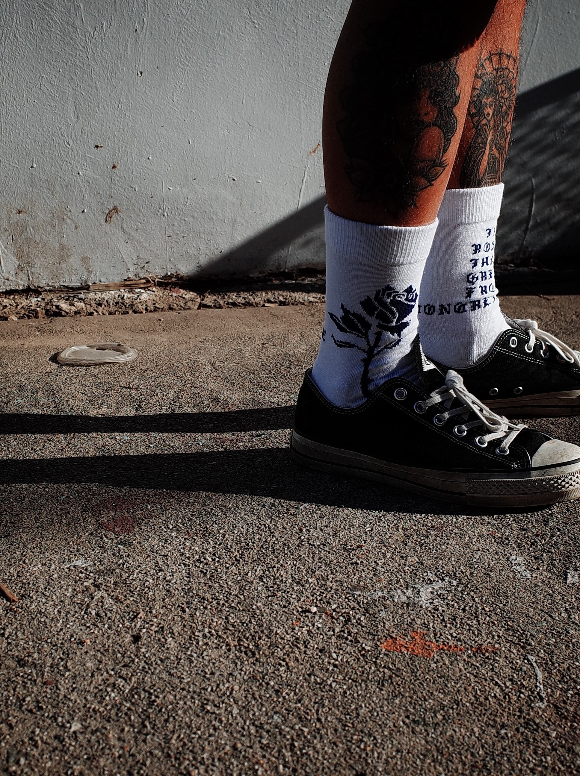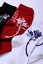 ローカットスニーカー着用時に、パンツの裾がふと捲れた際に 靴に薔薇を挿しているように見えるバランスでデザインしました。