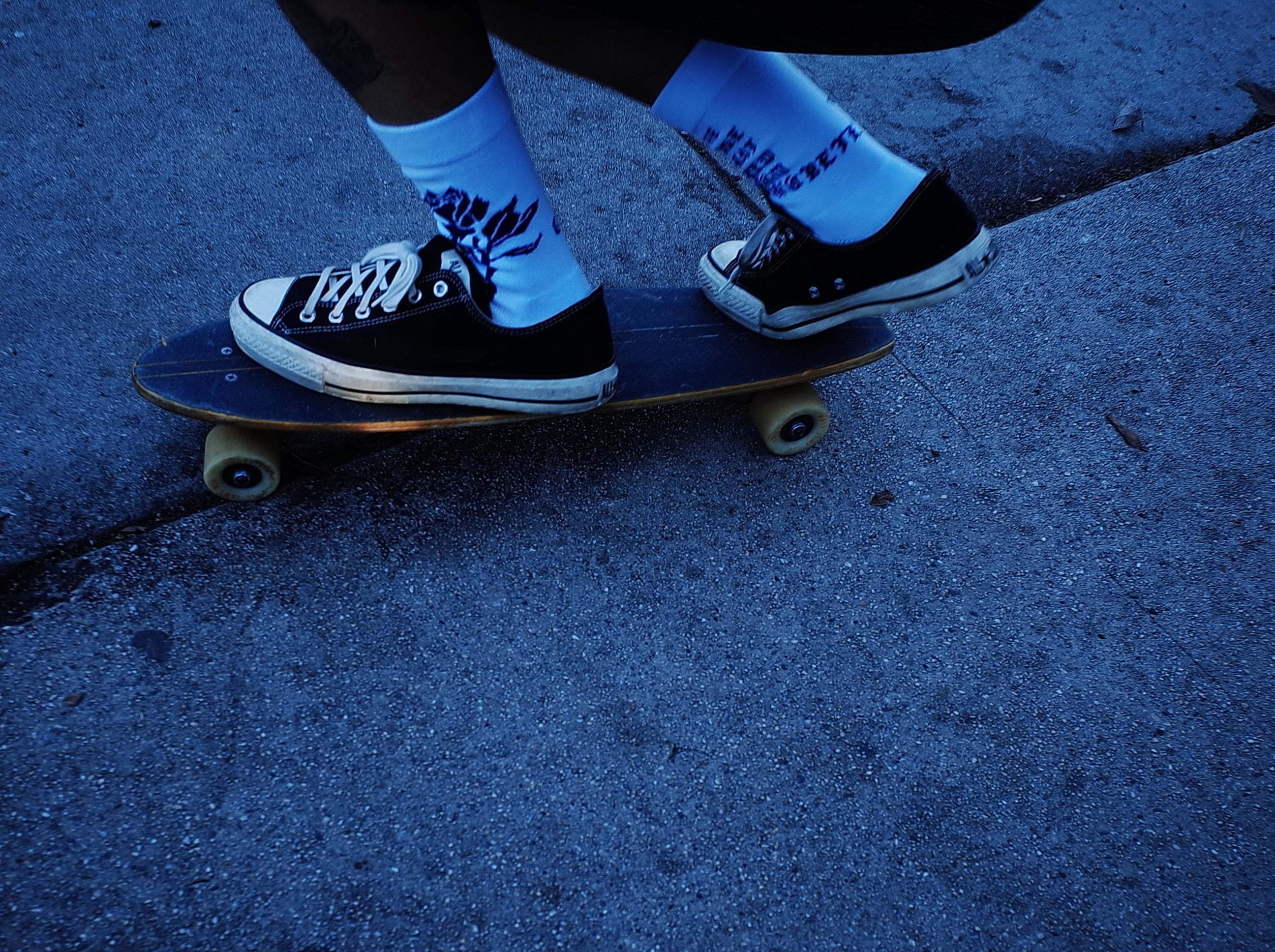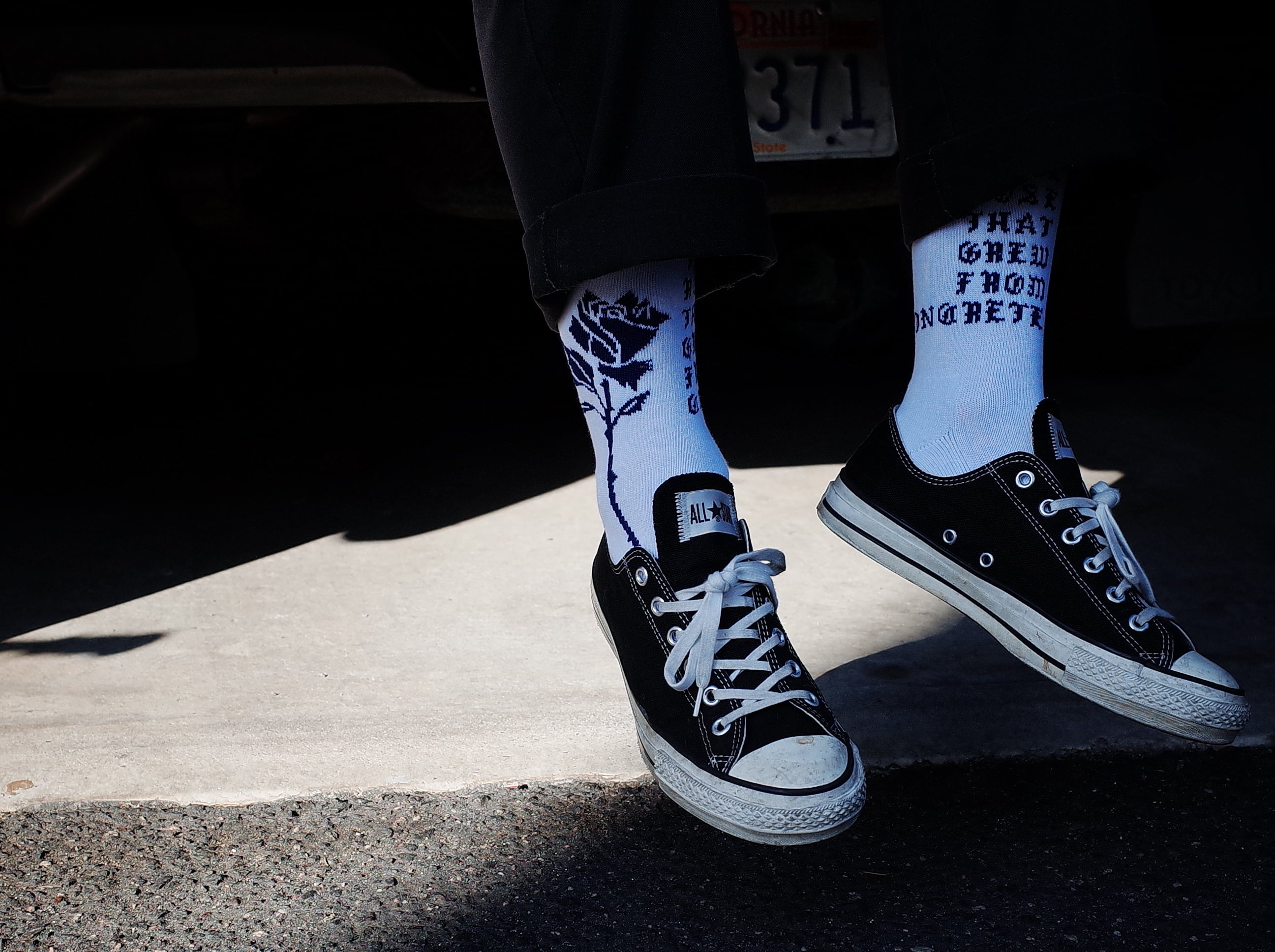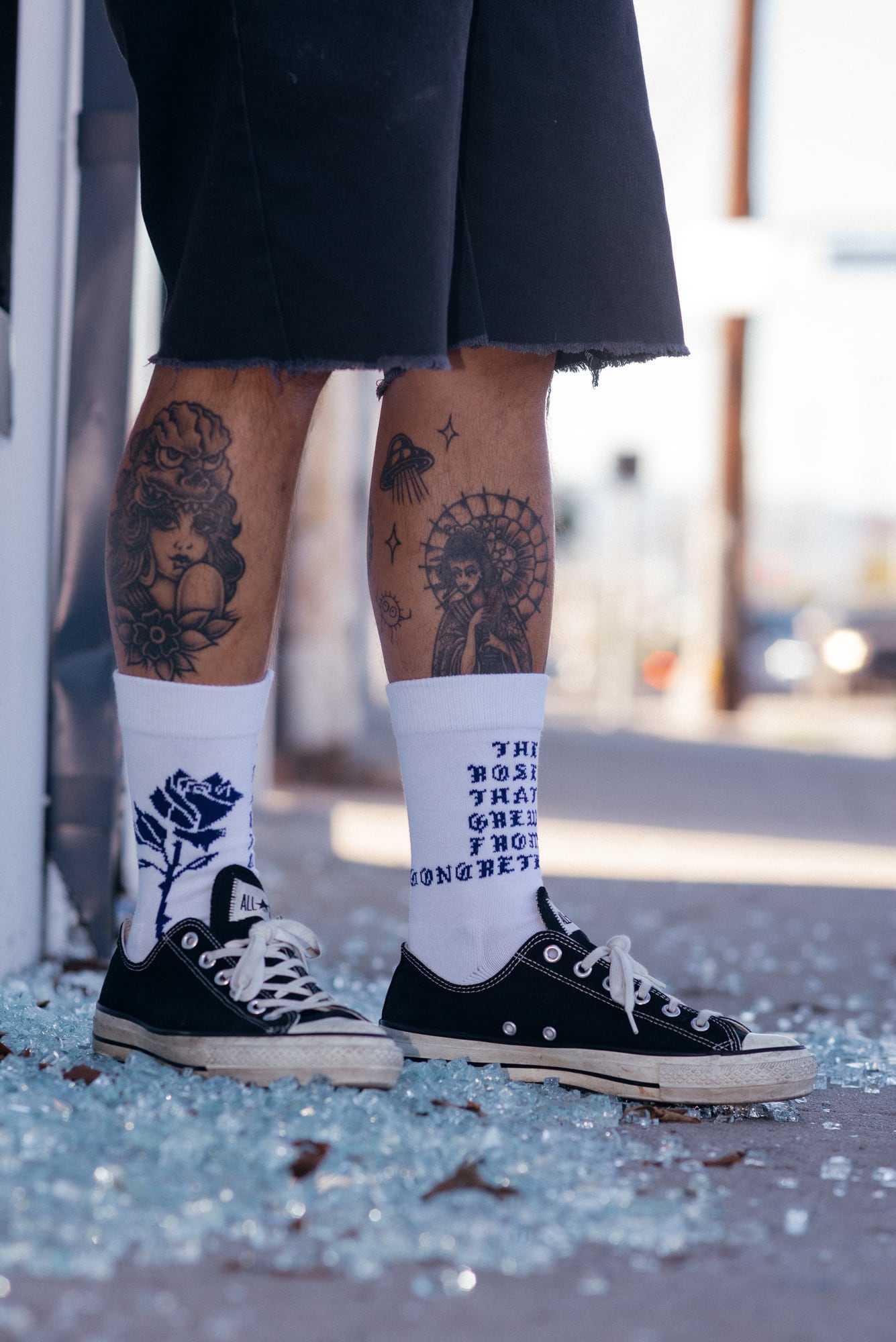 ローカットスニーカー着用時に、パンツの裾がふと捲れた際に 靴に薔薇を挿しているように見えるバランスでデザインしました。