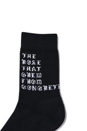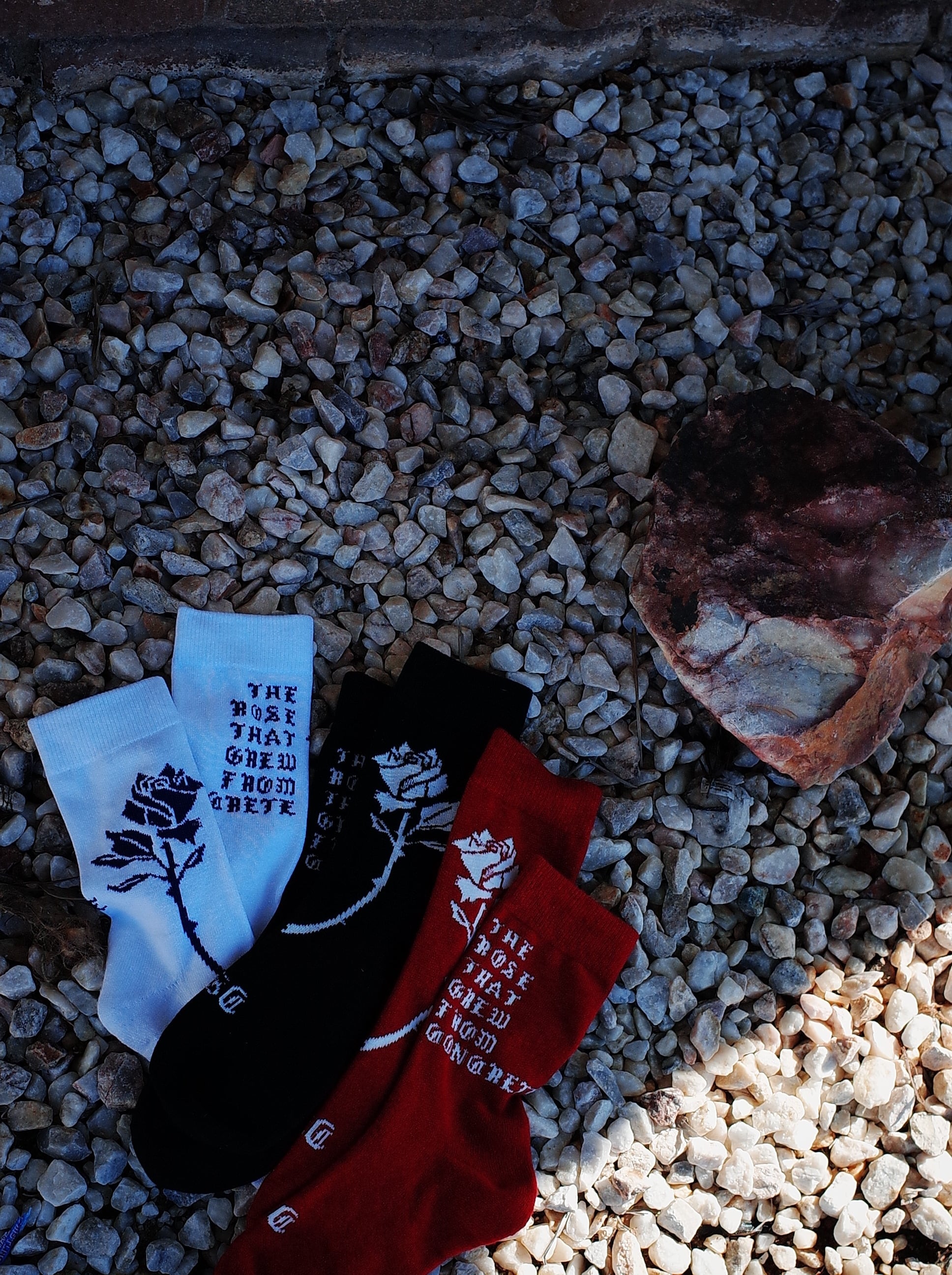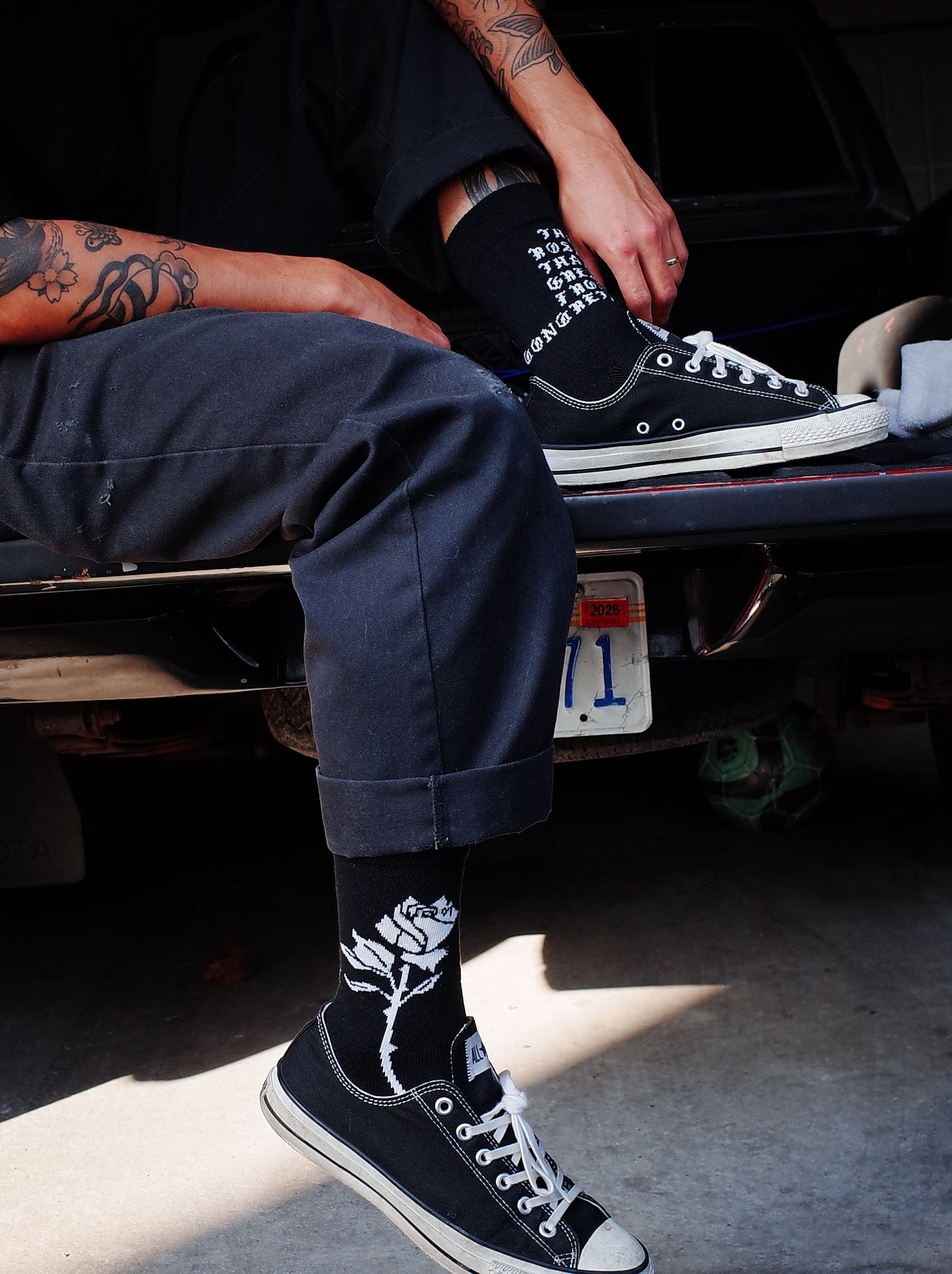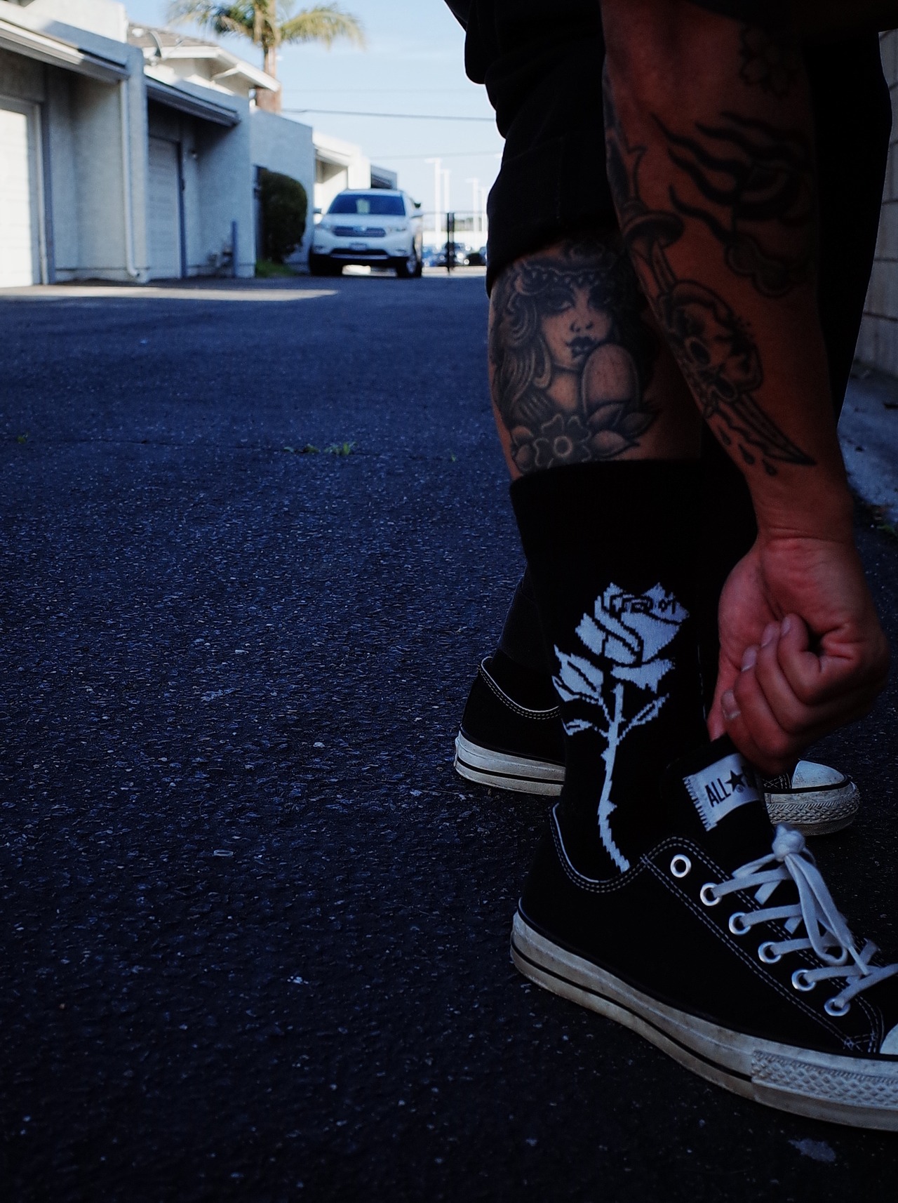 ローカットスニーカー着用時に、パンツの裾がふと捲れた際に 靴に薔薇を挿しているように見えるバランスでデザインしました。